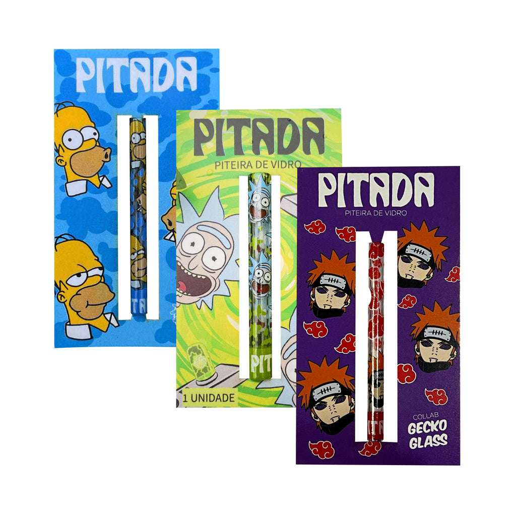 O kit contém 3 piteiras de vidro, cada uma estampada com personagens icônicos e designs exclusivos: