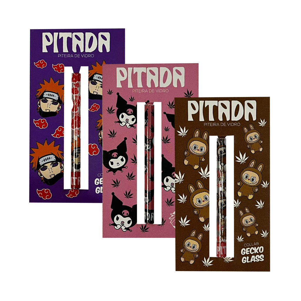 O kit contém 3 piteiras de vidro, cada uma estampada com personagens icônicos e designs exclusivos: